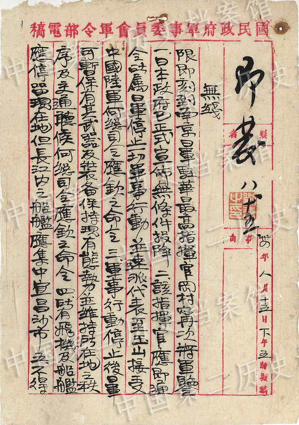 On August 15, 1945, Chiang Kai-shek sent a telegram to Yasuji Okamura. (Photo/Second Historical Archives of China)