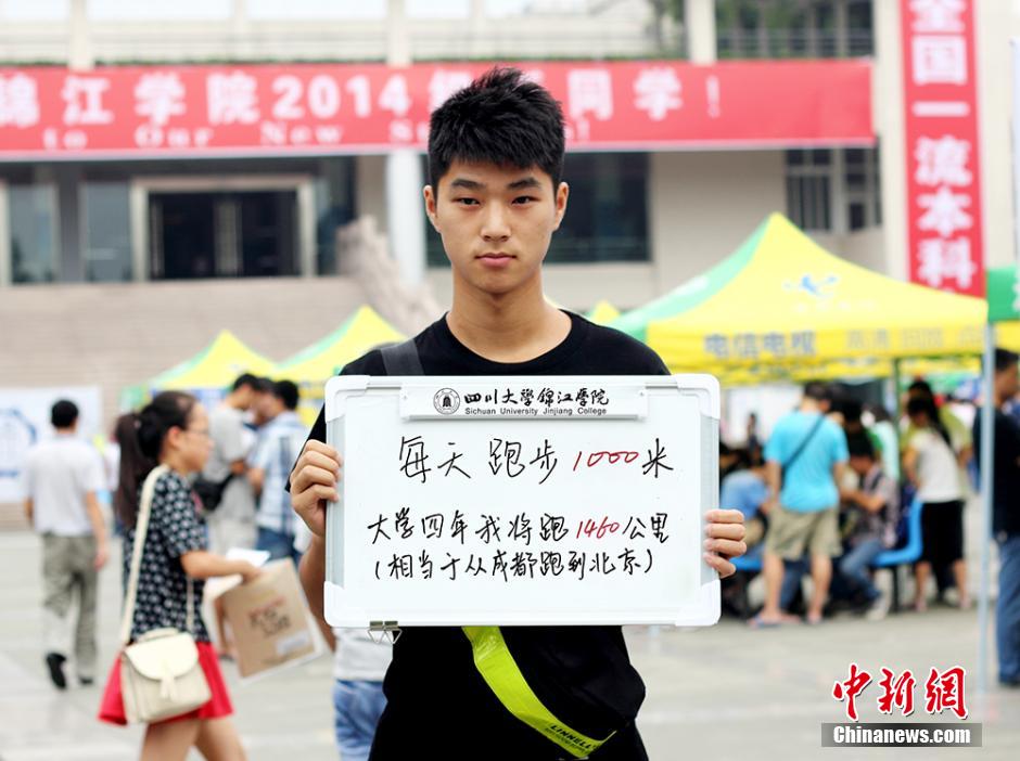 The board reads: "Running 1,000 meters per day, I'll run 1,460 kilometers (907 miles) in four years." (Chinanews/Xu Yaling)