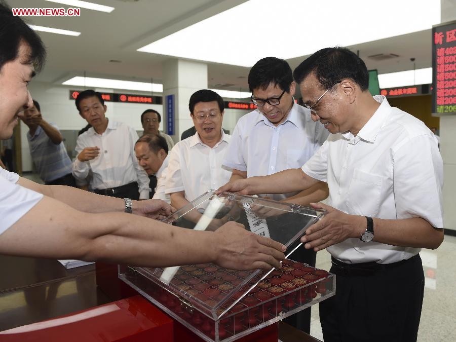 Chinese Premier Li Keqiang (1st R) looks at rubber stamps that went defunct after administrative procedures were simplified at an administrative approval service center of the Tianjin Binhai New Area in north China's Tianjin City, Sept. 11, 2014. Li Keqiang made an inspection tour of Tianjin on Thursday after attending the Summer Davos forum. (Xinhua/Li Xueren)