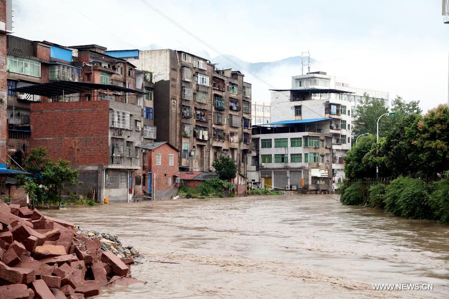 | A road is flooded in Guang'an City, southwest China's Sichuan Province, Sept. 13, 2014. A persistent rainfalll hit Guang'an from early morning of Sept. 13, causing serious urban waterlogging and flooding some croplands. Relief works are underway. (Xinhua/Zhou Songlin) |