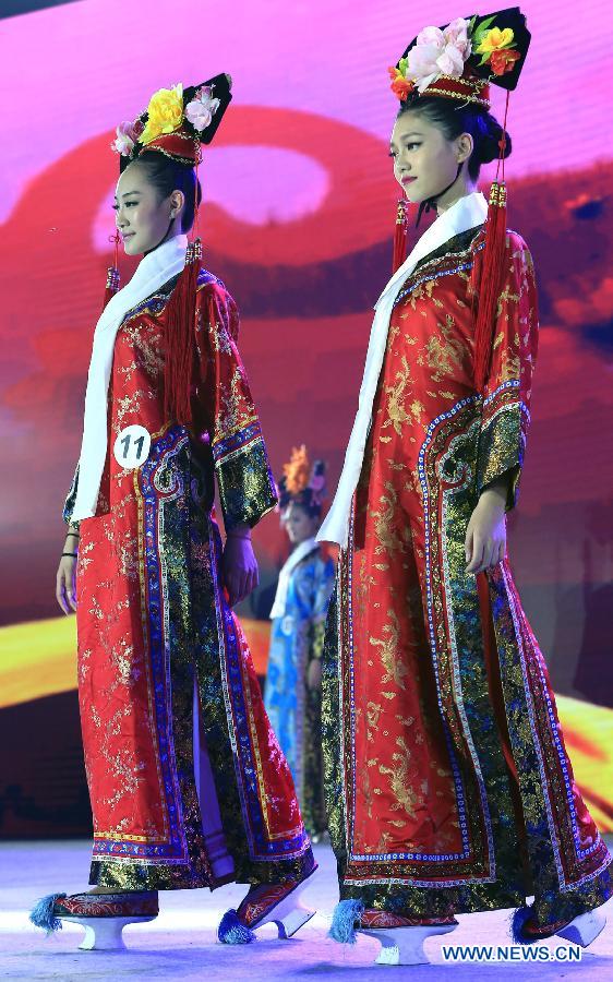 Contestants attend the evening dress session of the 9th Miss China Pageant final in Zhangbei County, north China's Hebei Province, Sept. 13, 2014. (Xinhua/Li Mingfang)