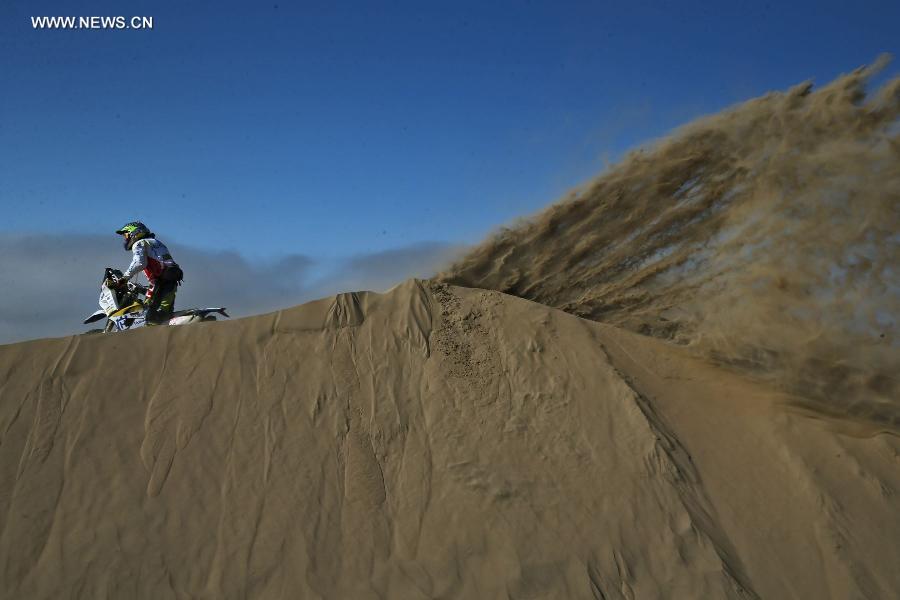 A pilot takes part in the second leg of the Inca Challenge 2014 of the Dakar series in Paracas, province of Pisco, Peru, on Sept. 13, 2014. (Xinhua/Oscar Farje Gomero/Andina)