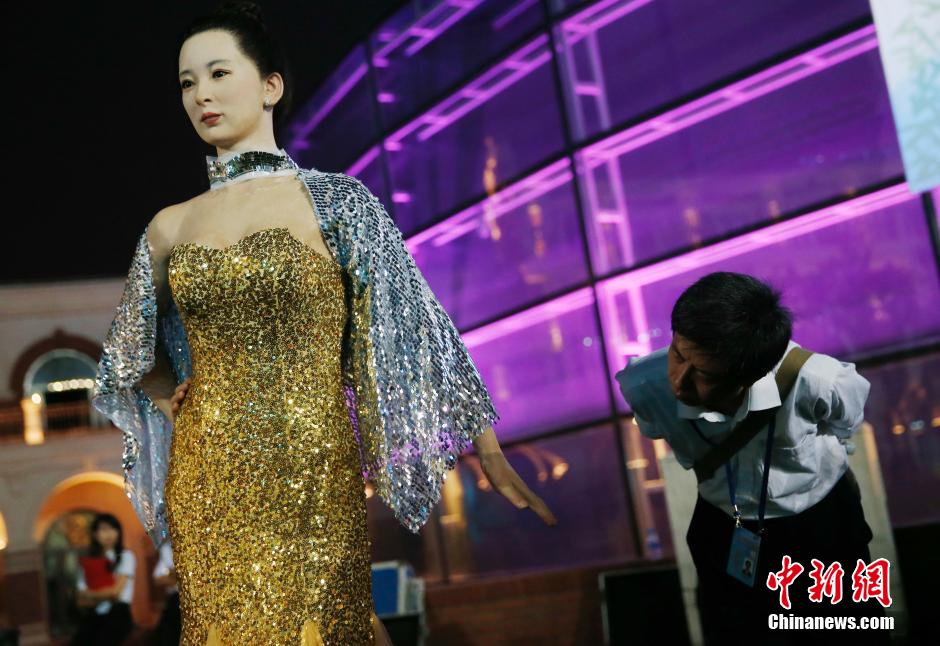 A robot “beauty” attracts much attention at the Davos forum in Tianjin Minyuan Stadium where the cultural night of the Dovos 2014 summer Forum is held. Guests from home and abroad experienced the charm of Tianjin by tasting local foods and enjoying artistic performances. (Chinanews.com/Tong Yu)