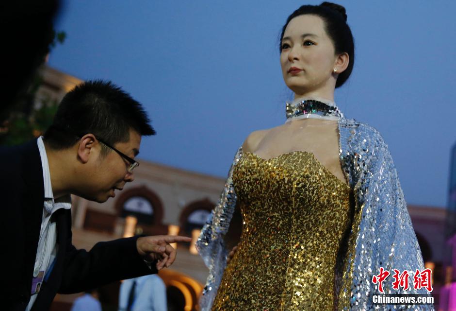 A robot “beauty” attracts much attention at the Davos forum in Tianjin Minyuan Stadium where the cultural night of the Dovos 2014 summer Forum is held. Guests from home and abroad experienced the charm of Tianjin by tasting local foods and enjoying artistic performances. (Chinanews.com/Tong Yu)