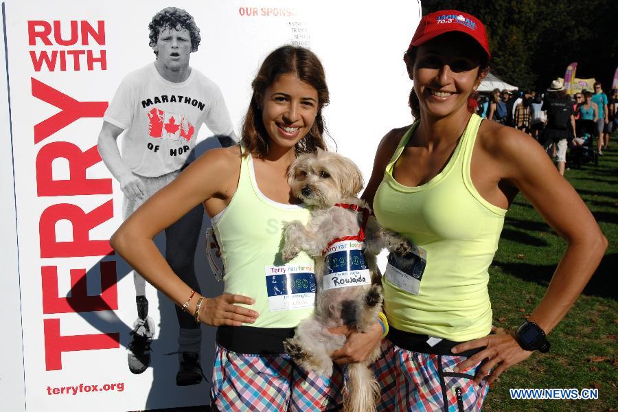 Runners pose for pictures in The Terry Fox Run 2014 in Stanley Park in Vancouver, Canada, on Sept. 14, 2014. Thousands of Participants pounded the pavement for the 34th time to raise money for the fight against cancer and to honour the legacy of Terry Fox and his Marathon of Hope. (Xinhua/Sergei Bachlakov)