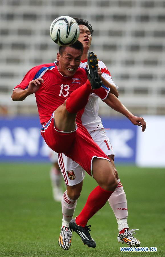 Sim Hyonjin (front) of the Democratic People's Republic of Korea (DPRK) vies with Xie Pengfei of China during their men's football first round group F match at the 17th Asian Games in Incheon, South Korea, on Sept. 15, 2014. (Xinhua/Zhang Fan)