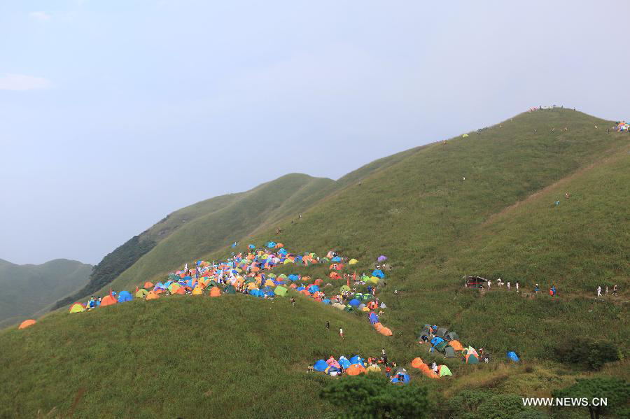 Travellers go hiking during the 7th Camping Festival of Mountain Wugong in Pingxiang, east China's Jiangxi Province, Sept. 13, 2014. The two-day camping from Sept. 13 to 14 attracted thousands of travellers all around the nation. (Xinhua/Zhang Hui)