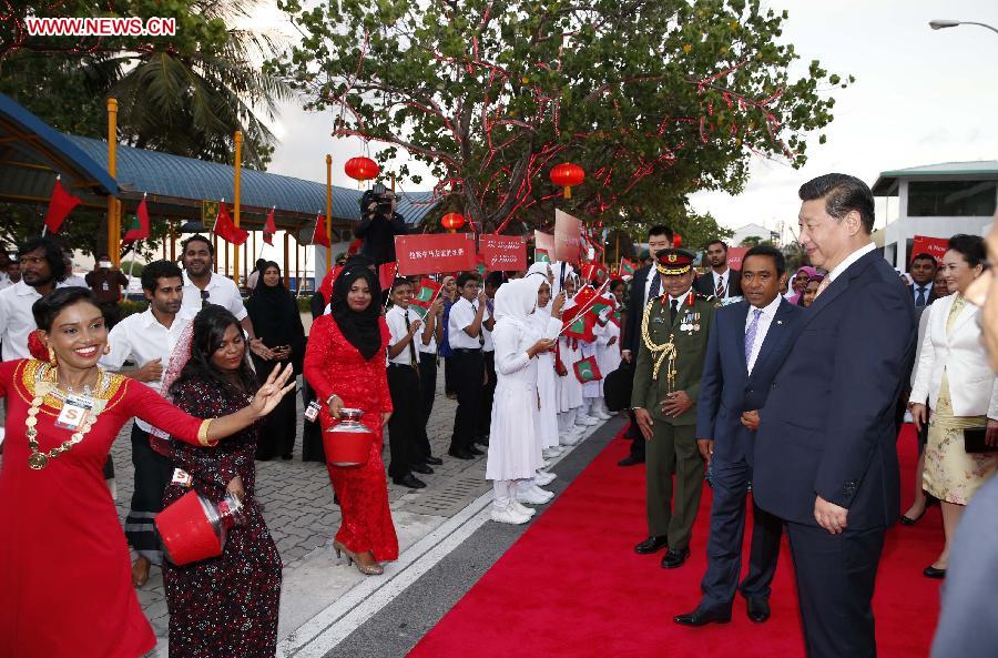 | Chinese President Xi Jinping (2nd R) and his wife Peng Liyuan (1st R) are welcomed by Maldivian President Abdulla Yameen (3rd R) upon their arrival in Male, Maldives, Sept. 14, 2014. Xi Jinping arrived here Sunday for a state visit to Maldives. (Xinhua/Ju Peng) |