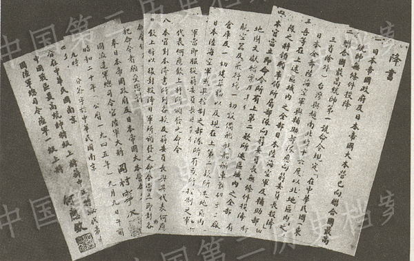 The surrender ceremony in Chinese theatre was held in Nanjing on September 9. He Yingqin was appointed as representative of both the Chinese government and the Southeast Asia Ally Forces to host the surrender of Japanese troops in China. On September 9, he accepted the statement of surrender submitted by Yasuji Okamura, General Commander of Japanese troops in China.