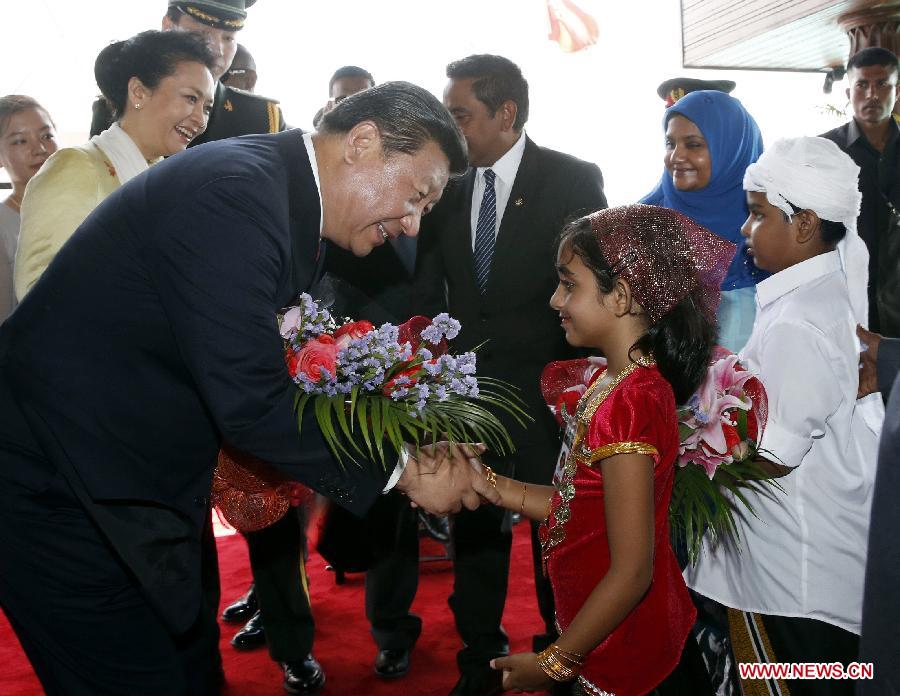 Chinese President Xi Jinping (L front) greets a girl during a welcome ceremony held by Maldivian President Abdulla Yameen Abdul Gayoom before their talks in Male, Maldives, Sept. 15, 2014. (Xinhua/Ju Peng)