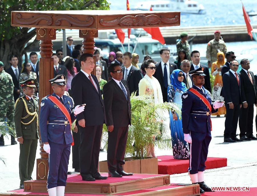 | Maldivian President Abdulla Yameen Abdul Gayoom holds a welcome ceremony for Chinese President Xi Jinping before their talks in Male, Maldives, Sept. 15, 2014. (Xinhua/Ma Zhancheng) |