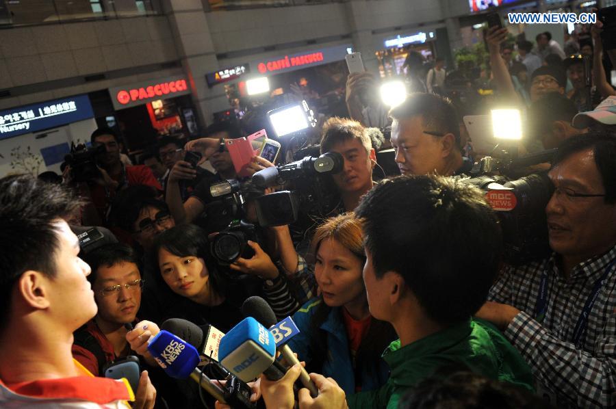 Chinese swimming athlete Sun Yang (1st L) receives an interview at the international airport in Incheon, South Korea, Sept. 16, 2014. Some members of the Chinese Sports Delegation arrived in Incheon on Tuesday afternoon to attend the 17th Asian Games. (Xinhua/Gong Lei)
