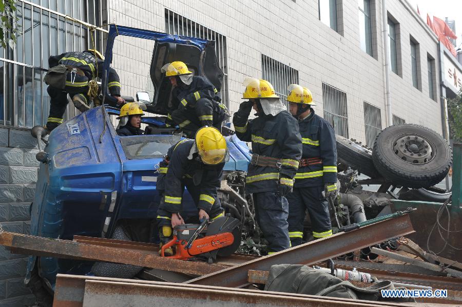 Rescuers work at the traffic accident site in Zhanjiakou City, north China's Hebei province, Sept. 16, 2014. A runaway truck crashed into a bus stop in Zhangjiakou on Tuesday morning, with 14 casualties reported, local authorities said. (Xinhua)