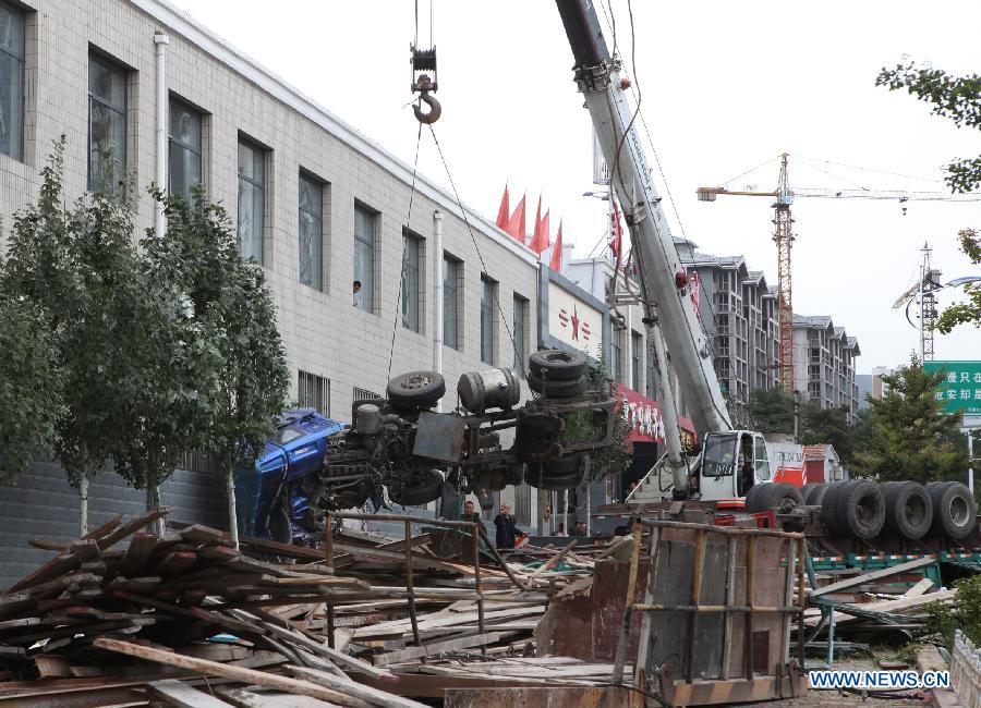 Rescuers work at the traffic accident site in Zhanjiakou City, north China's Hebei province, Sept. 16, 2014. A runaway truck crashed into a bus stop in Zhangjiakou on Tuesday morning, with 14 casualties reported, local authorities said. (Xinhua/Cao Dongyu)