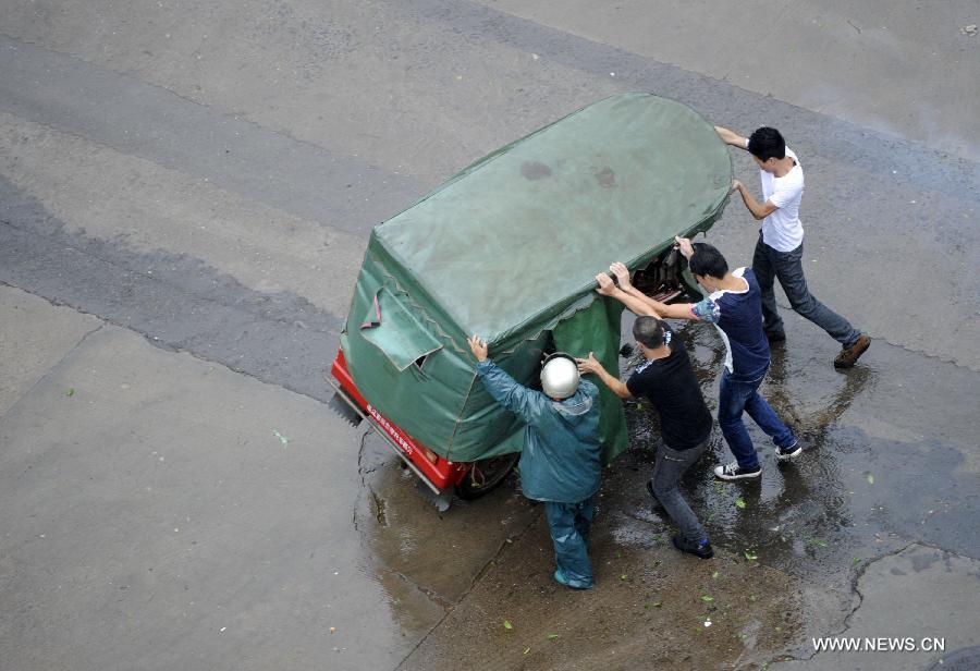 People help lift a tricycle blown down by strong wind in Xuwen County of Zhanjiang City, south China's Guangdong Province, Sept. 16, 2014. Typhoon Kalmaegi landed in the coastal areas of Xuwen County on Tuesday noon. (Xinhua/Liang Xu)
