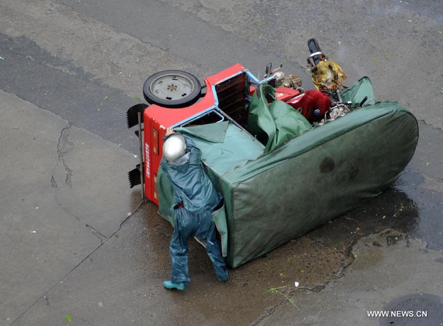 A tricycle is blown down by strong wind in Xuwen County of Zhanjiang City, south China's Guangdong Province, Sept. 16, 2014. Typhoon Kalmaegi landed in the coastal areas of Xuwen County on Tuesday noon. (Xinhua/Liang Xu)