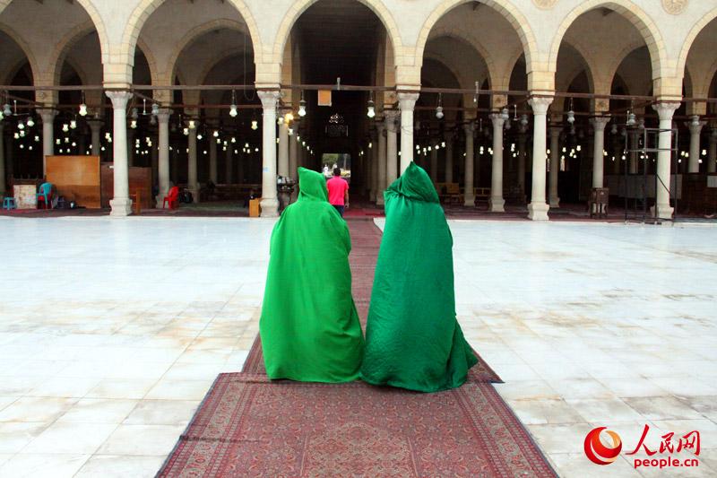 Two women wearing headscarves at the gate of the mosque in the city of Cairo, capital of Egypt on Sept. 14, 2014. (Photo/People's Daily Online)