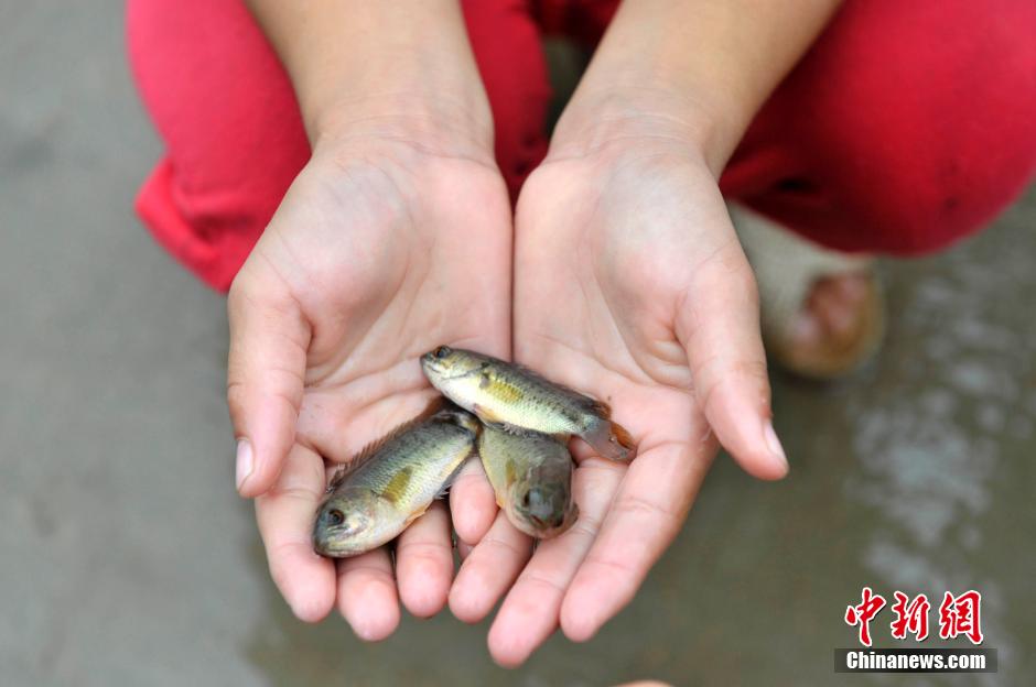 Children catch fish on the street in Wenchang, south China’s Hainan province on Sept. 16, 2014. (Photo/Chinanews.com)