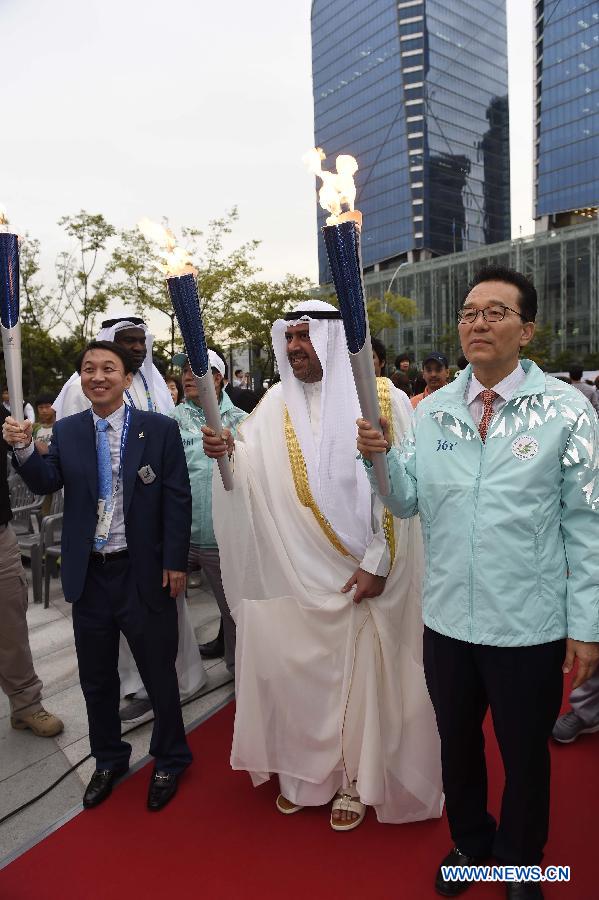 President of Olympic Council of Asia Ahmad Al-Fahad Al-Sabah (C), secretary-general of Incheon Asian Games Organizing Committee (IAGOC) Kwon Kyung-sang (R) and Yeonsu district chief Lee-Jaeho light a based torch during the Incheon Asian Games Torch Relay in Incheon, South Korea, Sept. 17, 2014. The 17th Asian Games will be held from Sept. 19 to Oct. 4. (Xinhua/Ye Pingfan)