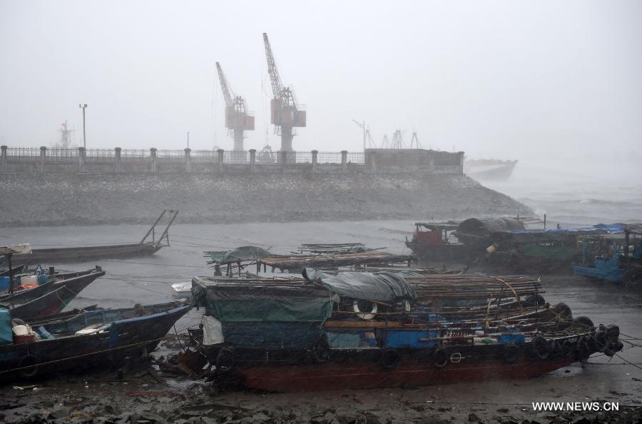 Fishing boats are seen at a harbour in Fangchenggang City, south China's Guangxi Zhuang Autonomous Region, Sept. 16, 2014. The fifteenth Typhoon Kalmaegi hit Guangxi on Tuesday, affecting about 294,700 local residents and forcing the relocation of 25,800 people. (Xinhua/Lu Boan)