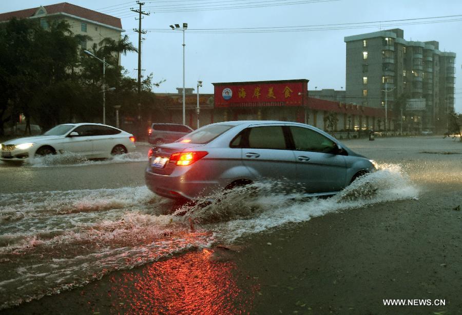 A car moves in a flooded street in Fangchenggang City, south China's Guangxi Zhuang Autonomous Region, Sept. 16, 2014. The fifteenth Typhoon Kalmaegi hit Guangxi on Tuesday, affecting about 294,700 local residents and forcing the relocation of 25,800 people. (Xinhua/Lu Boan)