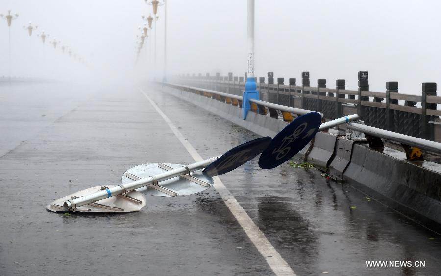 Photo taken on Sept. 16, 2014 shows road signs blown down by Typhoon Kalmaegi in Fangchenggang City, south China's Guangxi Zhuang Autonomous Region. The fifteenth Typhoon Kalmaegi hit Guangxi on Tuesday, affecting about 294,700 local residents and forcing the relocation of 25,800 people. (Xinhua/Lu Boan)