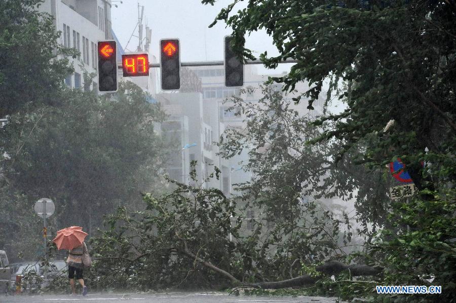 A woman walks past broken branches in typhoon-hit Qionghai City, south China's Hainan Province, Sept. 16, 2014. Typhoon Kalmaegi landed in the island province on Tuesday morning. (Xinhua/Meng Zhongde)