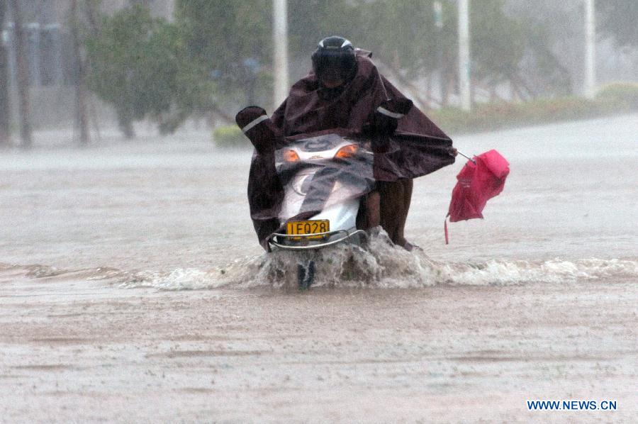 People ride on flooded road in typhoon-hit Qionghai City, south China's Hainan Province, Sept. 16, 2014. Typhoon Kalmaegi landed in the island province on Tuesday morning. (Xinhua/Meng Zhongde)