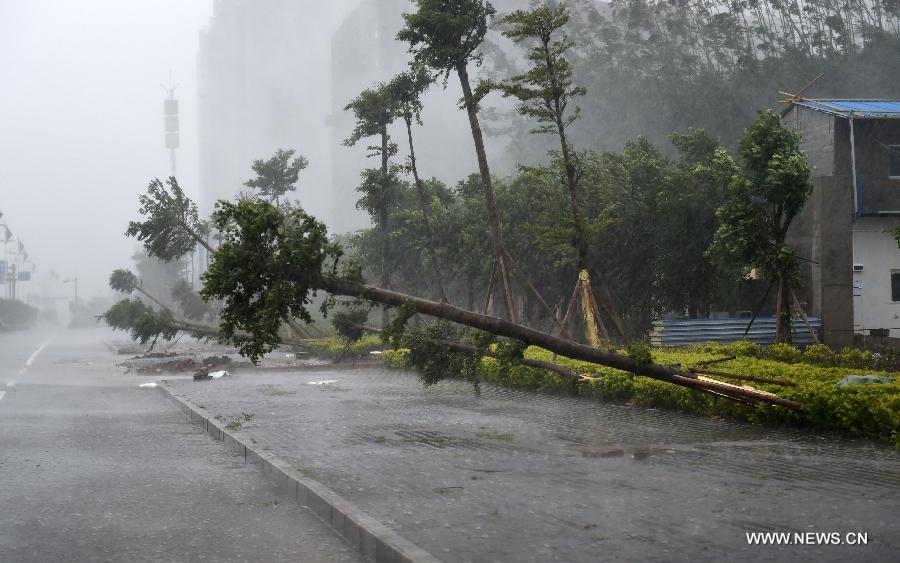 Photo taken on Sept. 16, 2014 shows trees blown down by Typhoon Kalmaegi in Fangchenggang City, south China's Guangxi Zhuang Autonomous Region. The fifteenth Typhoon Kalmaegi hit Guangxi on Tuesday, affecting about 294,700 local residents and forcing the relocation of 25,800 people. (Xinhua/Lu Boan)