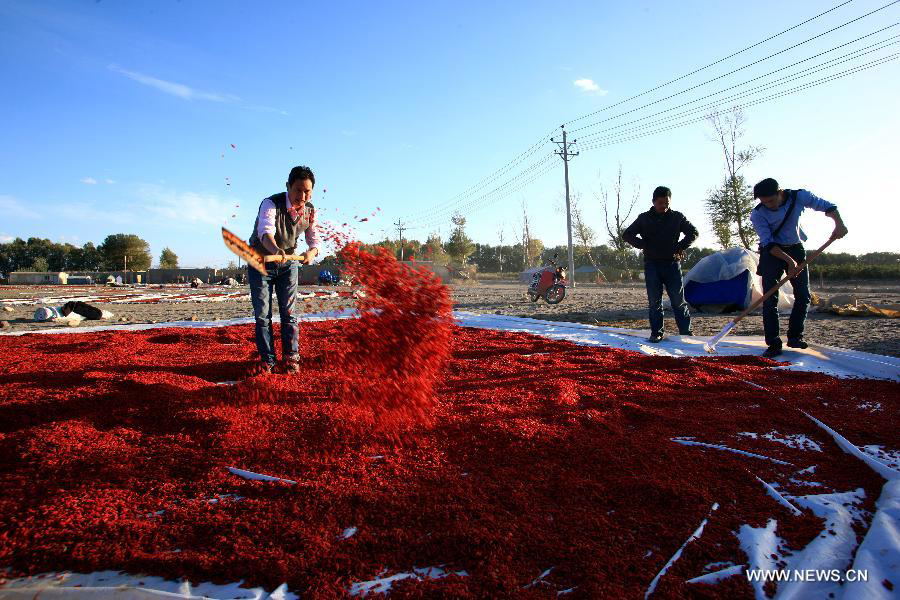 Farmers dry Chinese wolfberry in Dulan County of northwest China's Qinghai Province, Sept. 16, 2014. The output of Chinese woldberry in Dulan County reached 30,000 tons in 2014, with the production value of 900 million RMB yuan (145.8 million U.S. dollars). (Xinhua/Liu Dongjun)