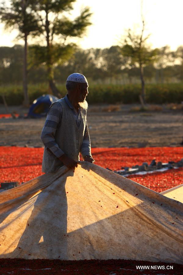 Farmers dry Chinese wolfberry in Dulan County of northwest China's Qinghai Province, Sept. 16, 2014. The output of Chinese woldberry in Dulan County reached 30,000 tons in 2014, with the production value of 900 million RMB yuan (145.8 million U.S. dollars). (Xinhua/Liu Dongjun)