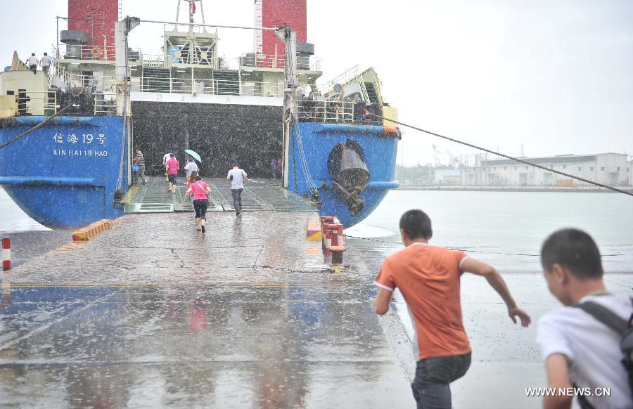Vehicles wait to board a ship at the Haikou Port in Haikou, capital of south China's Hainan Province, Sept. 17, 2014. Shipping on the Qiongzhou Strait has been resumed one day after typhoon Kalmaegi landed in the island province on Tuesday morning. (Xinhua/He Zhicheng)