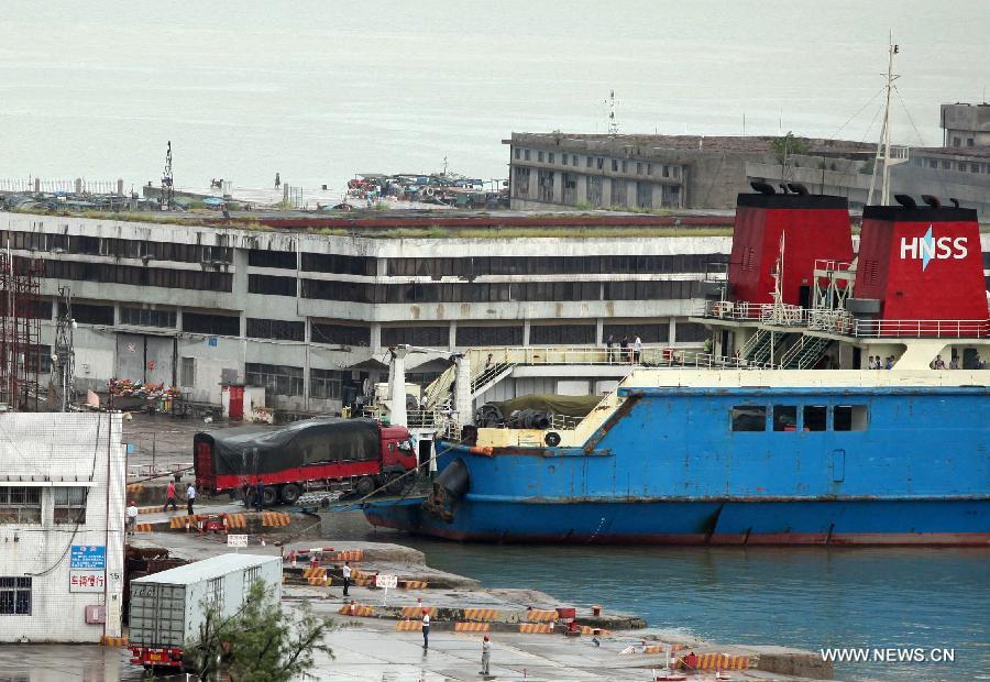 Vehicles wait to board a ship at the Haikou Port in Haikou, capital of south China's Hainan Province, Sept. 17, 2014. Shipping on the Qiongzhou Strait has been resumed one day after typhoon Kalmaegi landed in the island province on Tuesday morning. (Xinhua/He Zhicheng)