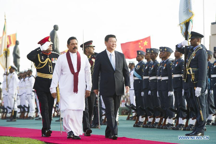 Sri Lankan President Mahinda Rajapaksa (L, front) holds a grand welcoming ceremony for Chinese President Xi Jinping (2nd L, front) in Colombo, Sri Lanka, Sept. 16, 2014. (Xinhua/Huang Jingwen)