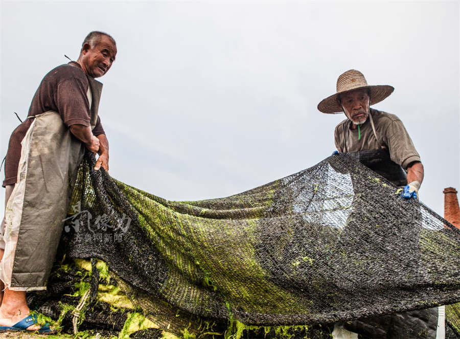 Two workers draw fishing nets. (www.iqilu.com/ Feng Xingcai)