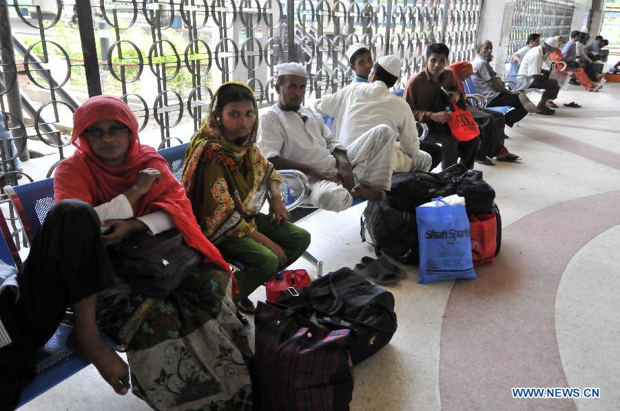 | Passengers wait for buses at a bus station during countrywide 24-hour strike enforced by Bangladeshi Islamist party Jamaat-e-Islami who demand release of their party leader in Dhaka, Bangladesh, Sept. 18, 2014. Bangladesh's largest Islamist party Wednesday called countrywide strike from Thursday to Friday and Sunday to Monday protesting the apex court verdict that awarded one of its high-ranking leader for war crimes of life imprisonment. (Xinhua/Shariful Islam) |