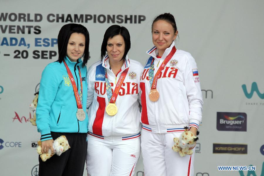 Russia's Julia Eydenzon (C), Ukraine's Viktoriya Rybovalova (L) and Russia's Olga Stepanova greet the spectators during the awarding ceremony for 10m Running Target Women at the 51st World Championship of the ISSF (International Shooting Sport Federation) at Granada, Spain, Sept. 17, 2014. Julia Eydenzon won the title of the event. (Xinhua)
