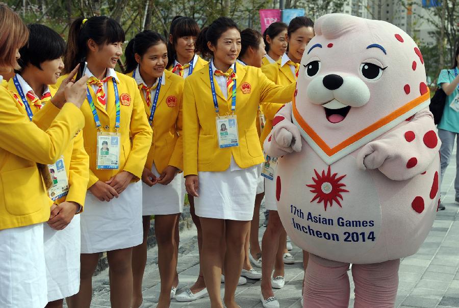 Athletes attending a flag-raising ceremony of Chinese delegation interact with a mascot at the Athletes' Village in Incheon, South Korea, Sept. 18, 2014. The Chinese delegation to the 17th Asian Games held flag-raising ceremony at the Athletes' Village on Thursday. (Xinhua/Han Yuqing)
