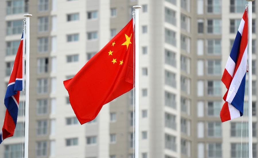 China's national flag is raised during the flag-raising ceremony of the Chinese delegation at the Athletes' Village of the 17th Asian Games in Incheon, South Korea, Sept. 18, 2014. (Xinhua/Zhu Zheng)