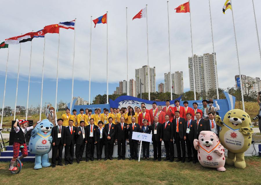 Members of the Chinese delegation to the 17th Asian Games pose for a group photo during a flag-raising ceremony at the Athletes' Village in Incheon, South Korea, Sept. 18, 2014. The Chinese delegation to the 17th Asian Games held flag-raising ceremony at the Athletes' Village on Thursday. (Xinhua/Xie Haining)