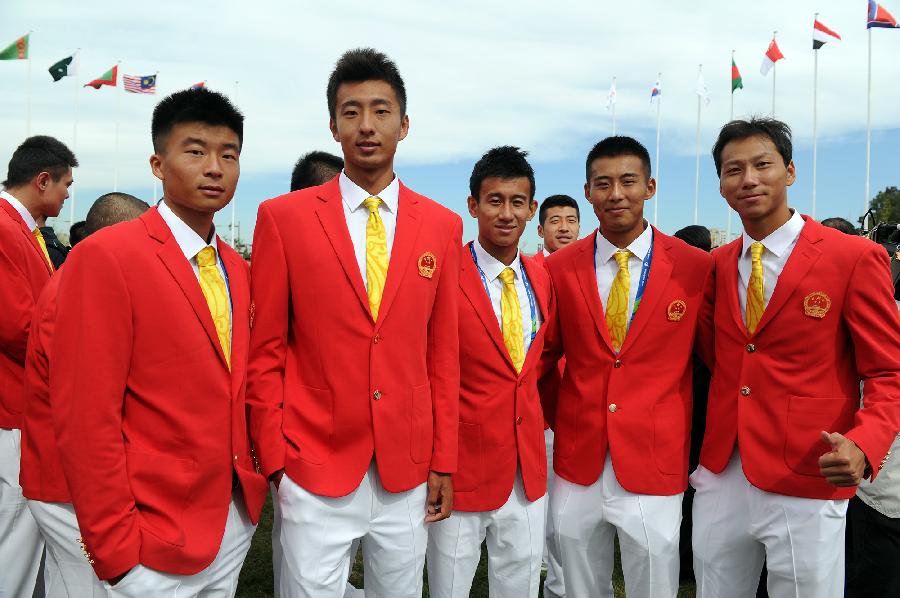 Members of Chinese delegation pose for a group photo during a flag-raising ceremony at the Athletes' Village in Incheon, South Korea, Sept. 18, 2014. The Chinese delegation to the 17th Asian Games held flag-raising ceremony at the Athletes' Village on Thursday. (Xinhua/Han Yuqing)