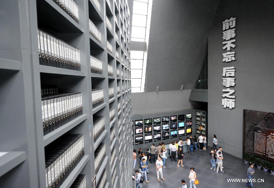 People visit the archives wall at the Memorial Hall of the Victims of the Nanjing Massacre by Japanese Invaders in Nanjing, capital of east China's Jiangsu Province, Sept. 18, 2014, the day marking the 83rd anniversary of the "September 18 Incident". On Sept. 18, 1931, Japanese troops blew up a section of the railway under their control near Shenyang, capital of northeast China's Liaoning Province, and then accused Chinese troops of sabotage as a pretext for attack. They bombarded barracks near Shenyang the same evening, beginning a large-scale armed invasion of northeast China. The incident was followed by Japan's full-scale invasion of China and the rest of Asia, triggering the war against Japanese aggression. (Xinhua/Sun Can)