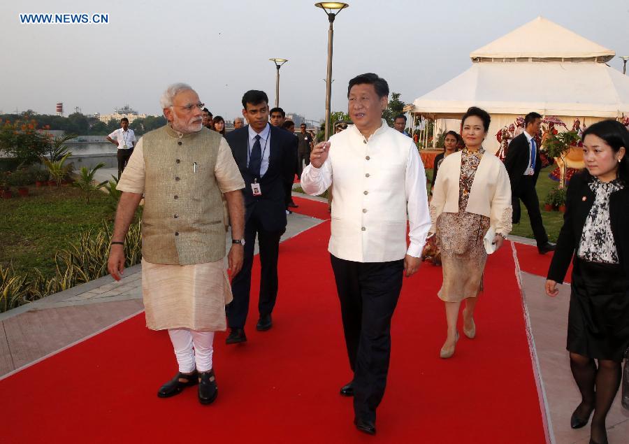 Chinese President Xi Jinping (C) and Indian Prime Minister Narendra Modi (1st L) visit a riverside park development project in Gujarat, India, Sept. 17, 2014. Xi Jinping visited the state of Gujarat on Wednesday. (Xinhua/Ju Peng)