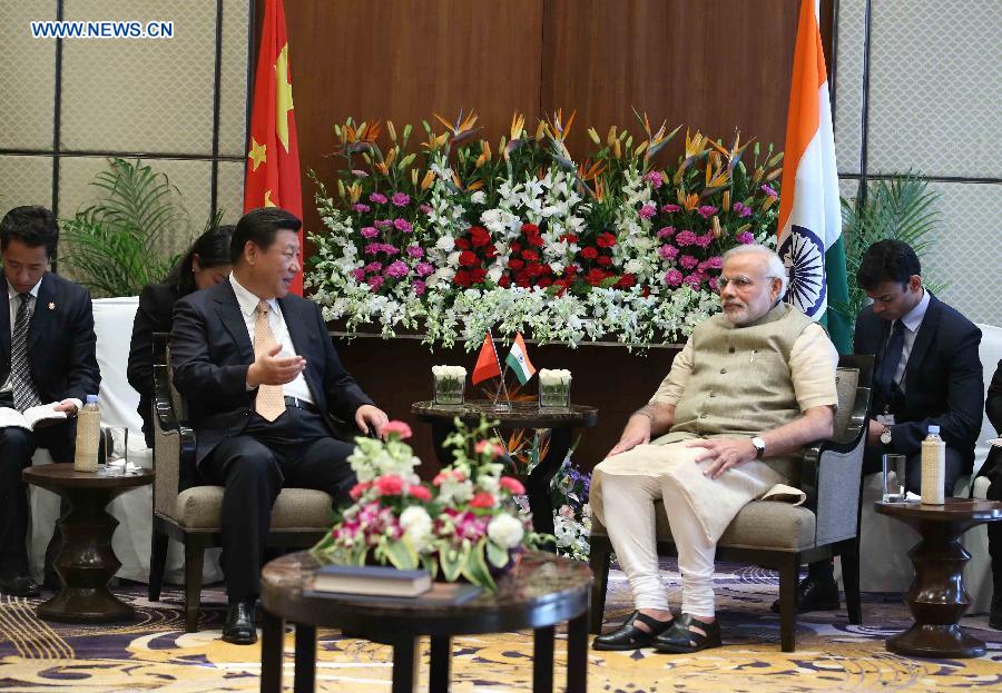 Chinese President Xi Jinping (L) meets with Indian Prime Minister Narendra Modi in Ahmedabad of Gujarat, India, Sept. 17, 2014. (Xinhua/Yao Dawei)