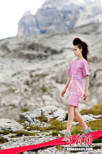 Super models from a Chinese reality show wearing 12cm high heels walk on the 50-meter red carpet on Dolomiti Di Brenta, the Alps in Italy on Sept. 10, 2014. (CNS/GXTV)