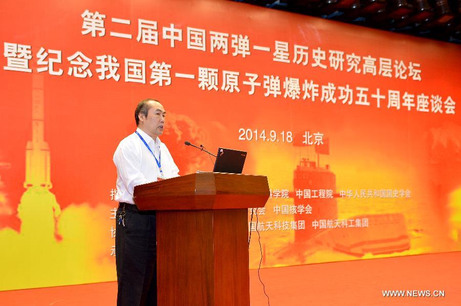 Zhang Qin, vice president of the China Association for Science and Technology, speaks at a seminar commemorating the 50th anniversary of the success in the country's first atomic bomb, in Beijing, China, Sept. 18, 2014. (Xinhua/Li Xin)