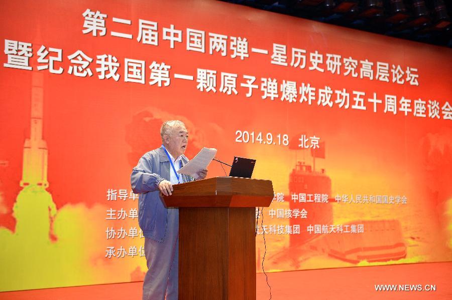 Wang Naiyan, academician of the Chinese Academy of Sciences, makes a report at a seminar commemorating the 50th anniversary of the success in the country's first atomic bomb, in Beijing, China, Sept. 18, 2014. (Xinhua/Li Xin)