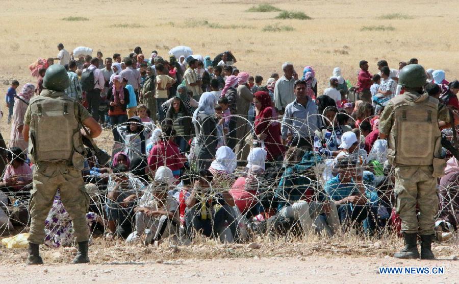 Turkish army block Syrians from crossing into Turkey in the province of Sanliurfa, near the Turkish-Syrian border on Turkey's side, Sept. 18, 2014. Thousands of Syrians crowded around the border line on Sept. 18 after that Jihadists from the Islamic State have seized a string of villages in northern Syria. (Xinhua/Mert Macit)