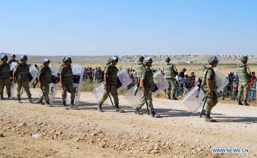 Turkish army block Syrians from crossing into Turkey in the province of Sanliurfa, near the Turkish-Syrian border on Turkey's side, Sept. 18, 2014. Thousands of Syrians crowded around the border line on Sept. 18 after that Jihadists from the Islamic State have seized a string of villages in northern Syria. (Xinhua/Mert Macit)