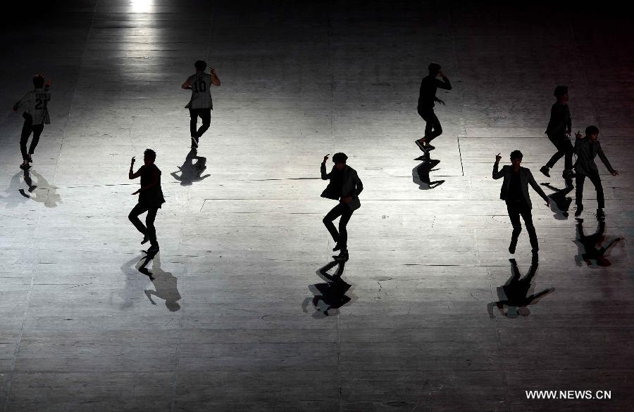 South Korean pop group EXO performs before the opening ceremony of the 17th Asian Games at the Incheon Asiad Main Stadium in Incheon, South Korea, Sept. 19, 2014. (Xinhua/Lin Yiguang)